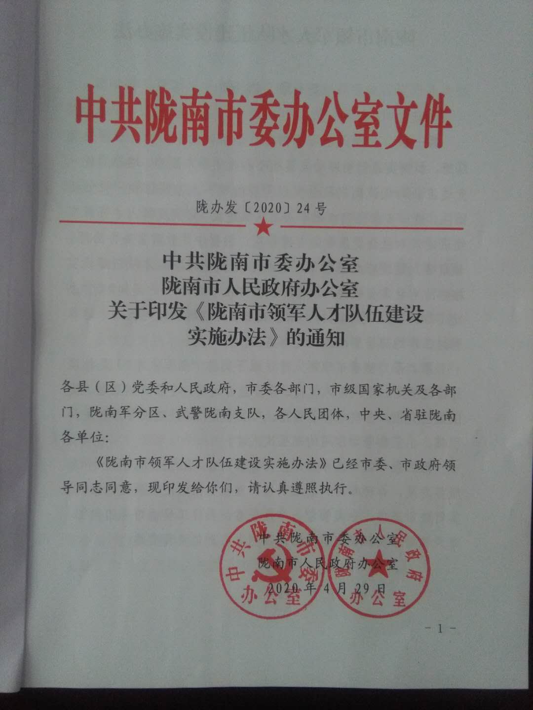 4月29日,中共陇南市委办公室、市人民政府办公室下发《陇南市领军人才队伍建设实施办法》(陇办发2020[24]号),请各学院利用例会时间组织学习。